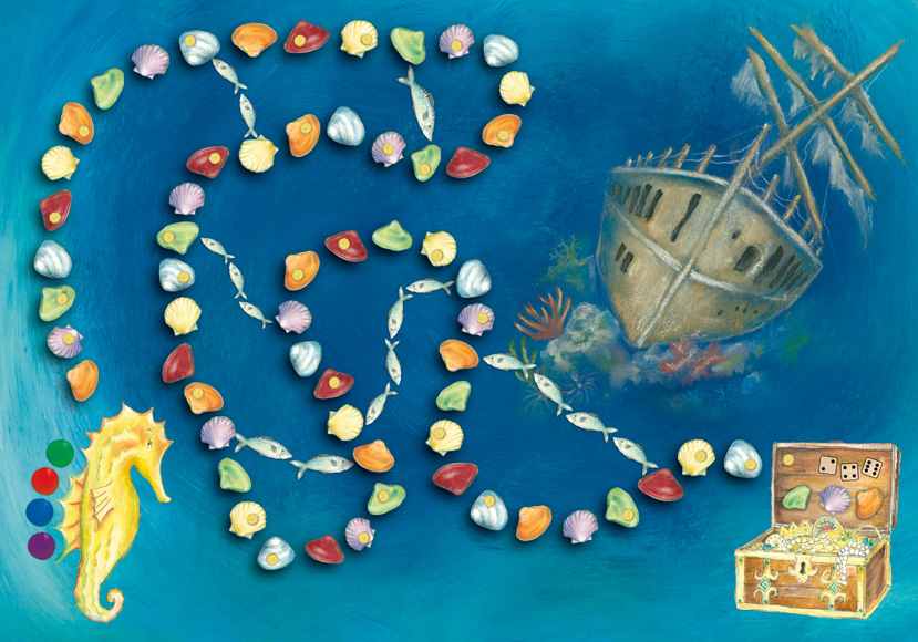 Layut/Gestaltung von Schriftzug, Schachtel, Spielplan mit Figuren,